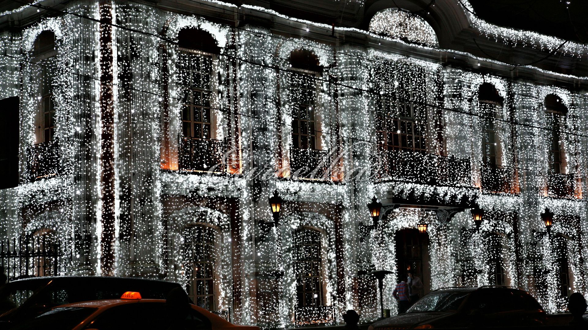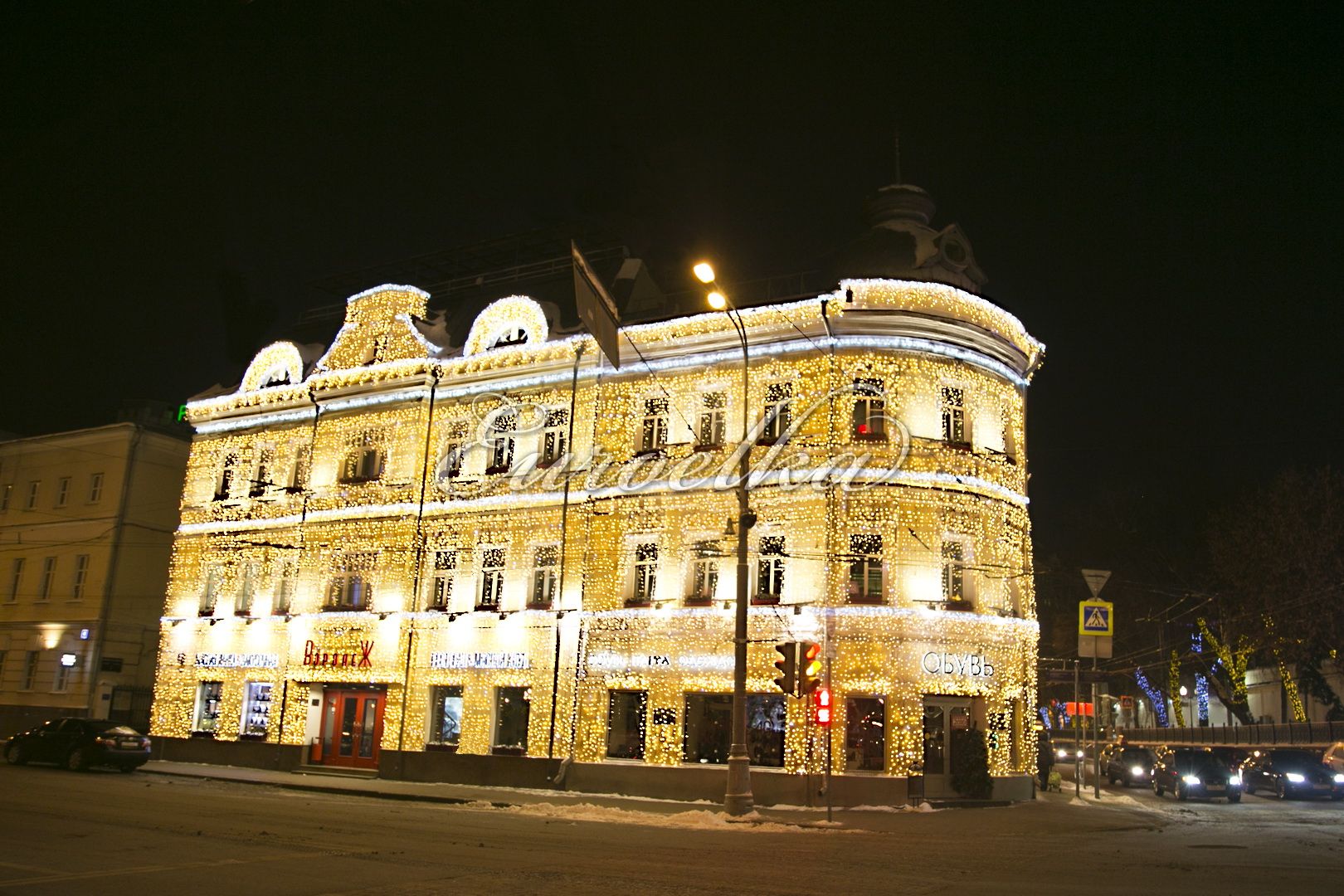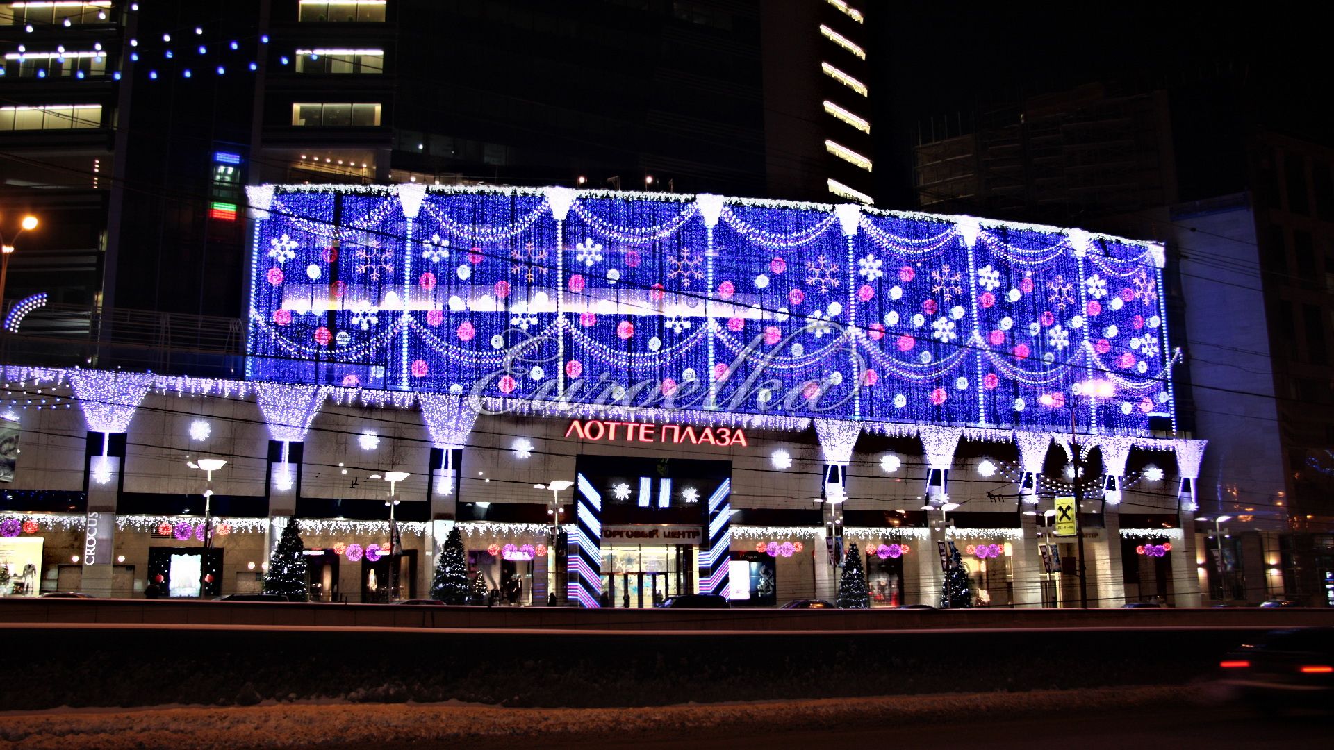 Для новогоднего освещения фасадов используются различные цветные и цветодинамические гирлянды, гибкая неоновая подсветка и множество различных аксессуаров. Новогоднее освещение отличается от повседневного, так как должно подчеркнуть праздник декором и цветовым рядом. Повседневное освещение несет в себе функциональный замысел, но его также можно разнообразить по просьбе заказчика.